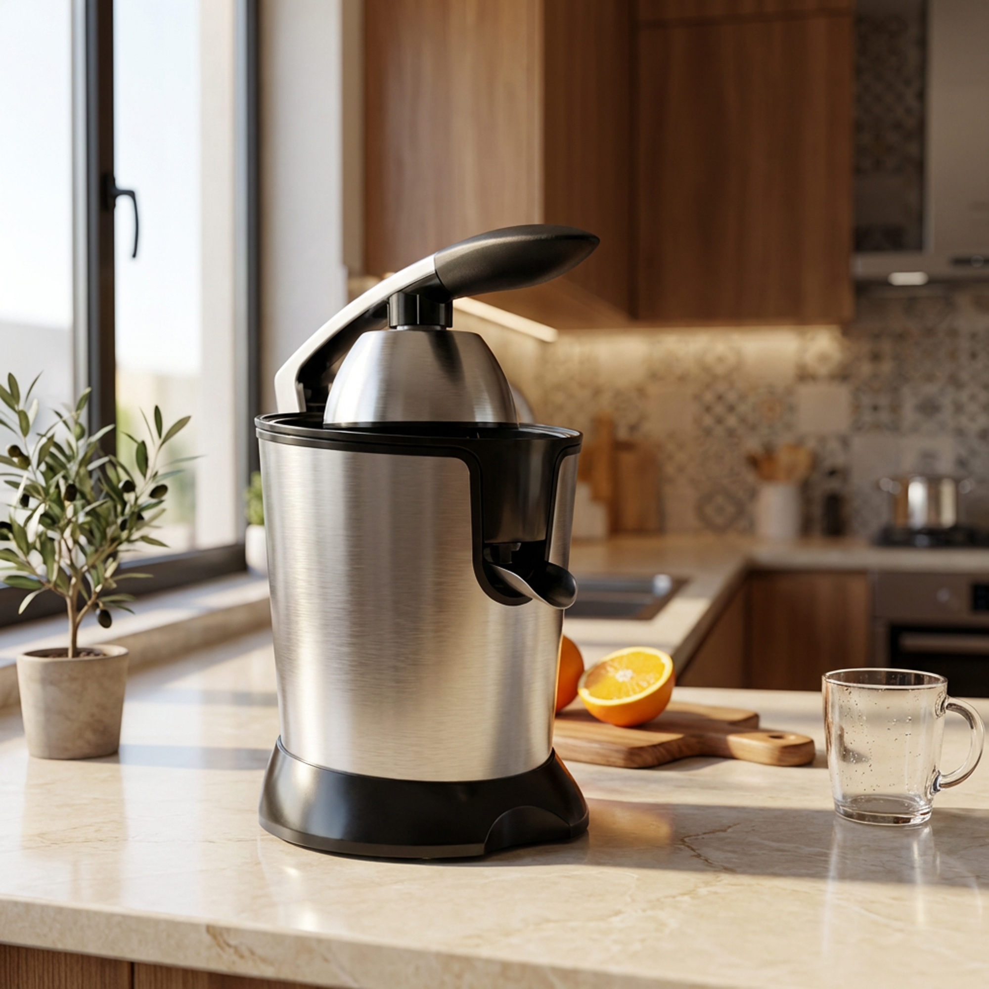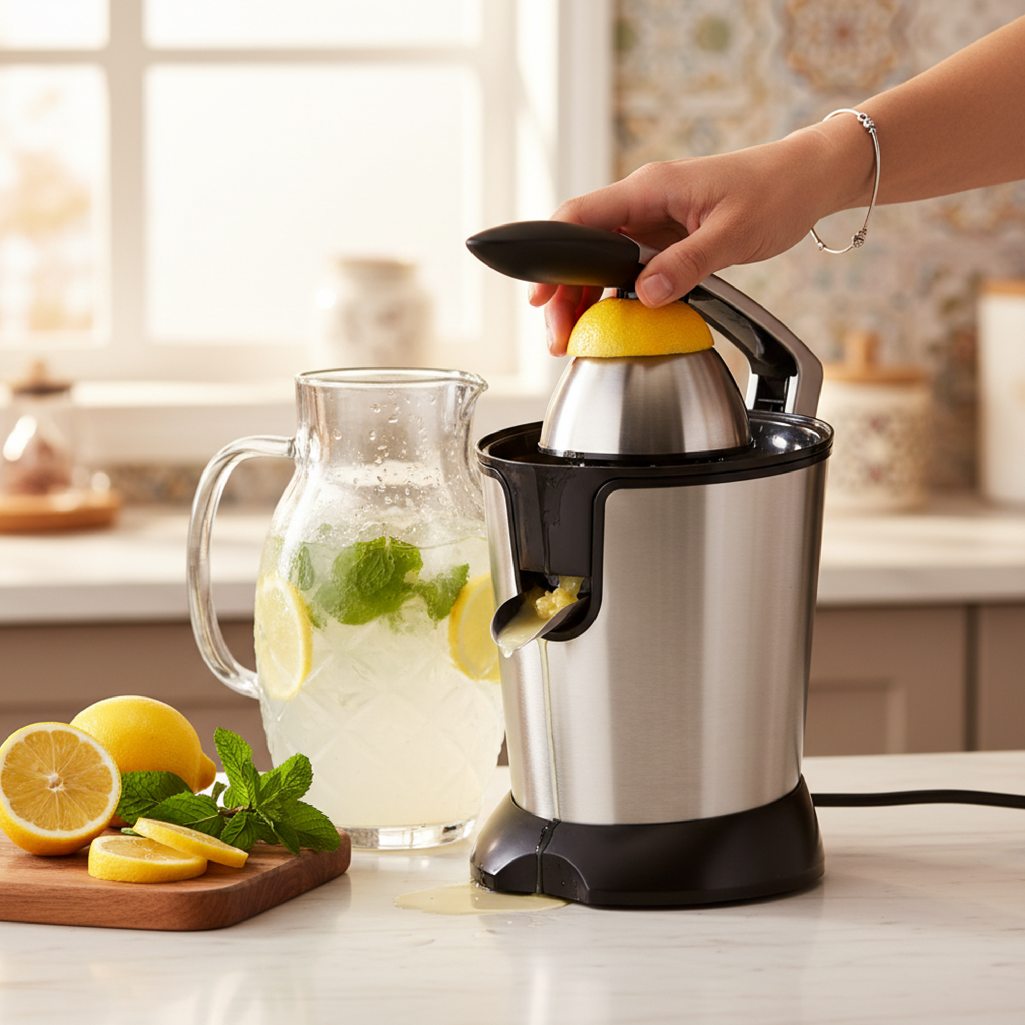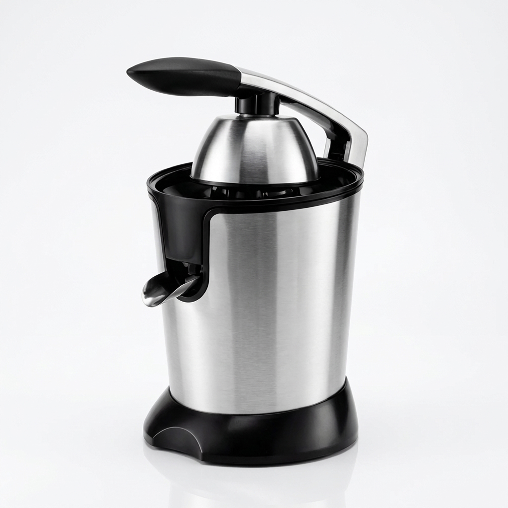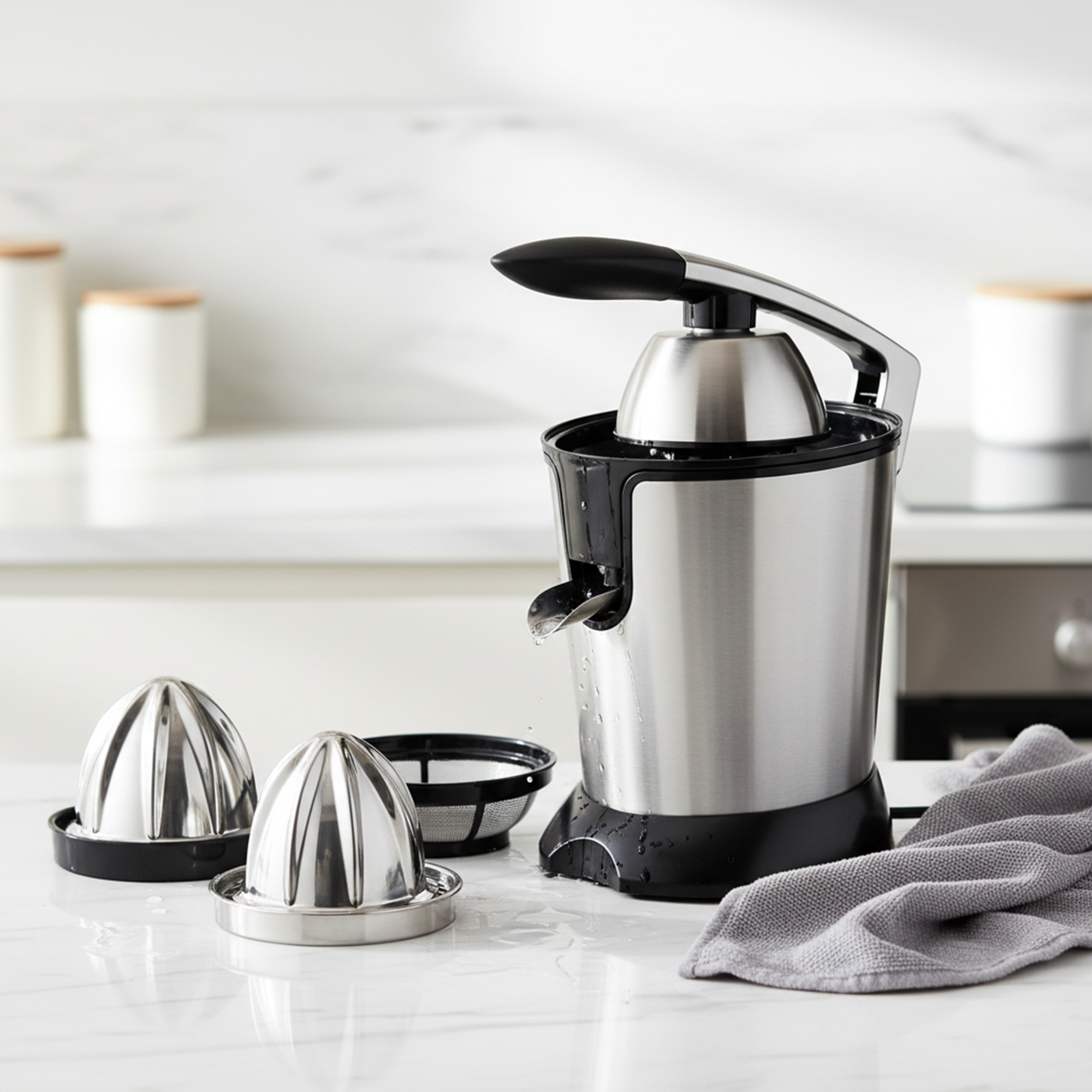 تحط ثمرة الحمضيات على المخروط، تضغط عليها لتشغيل العصارة تلقائيًا، ويبدأ استخراج العصير بسهولة، وبعد الانتهاء تفك الرأس وتنظفه بكل بساطة.