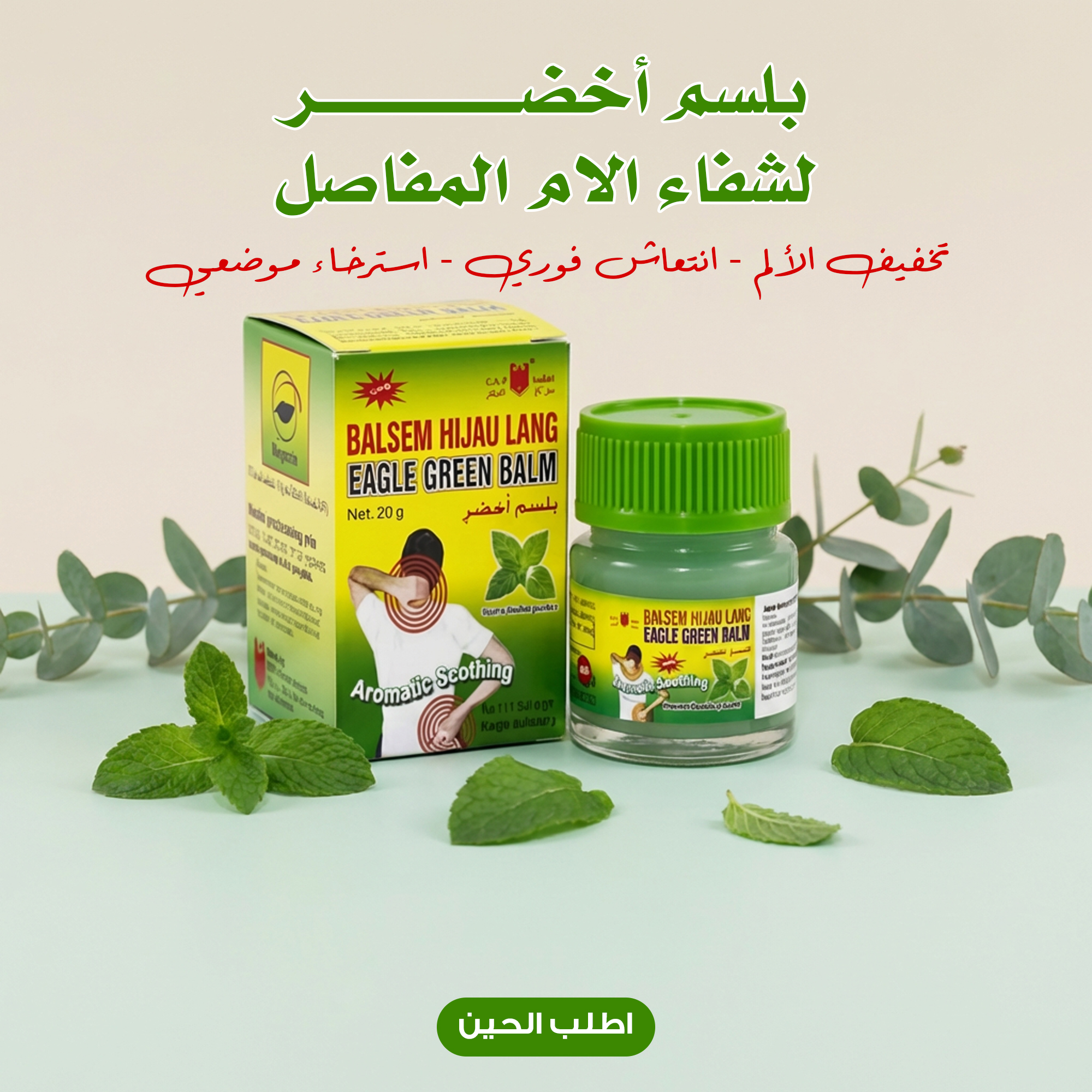 المميزات يخفف آلام المفاصل والعضلات بسرعة ملحوظة يساعد على استرخاء العضلات بعد المجهود اليومي يمنح إحساس بالبرودة والانتعاش الفوري تركيبة عشبية لطيفة وآمنة على الجلد سريع الامتصاص بدون أثر دهني مزعج مناسب للاستخدام اليومي ولمختلف الأعمار حجم صغير سهل الحمل والاستخدام بأي وقت ـــــــــــــــــــــــــــــــــــــــــ تفاصيل سريعة الماركة: Eagle النوع: بلسم موضعي لتخفيف الألم الاستخدام: آلام المفاصل والعضلات الحجم: 20 جم التركيبة: مكونات طبيعية عشبية الامتصاص: سريع الملاءمة: مناسب لجميع الأعمار ـــــــــــــــــــــــــــــــــــــــــ محتويات العبوة بلسم أخضر لتخفيف آلام المفاصل 20 جم ـــــــــــــــــــــــــــــــــــــــــ كيفية الاستخدام تنظيف وتجفيف المنطقة المصابة قبل الاستخدام وضع كمية صغيرة من البلسم تدليك بلطف بحركات دائرية حتى الامتصاص يستخدم من مرتين إلى ثلاث يوميًا حسب الحاجة للاستعمال الخارجي فقط المميزات يخفف آلام المفاصل والعضلات بسرعة ملحوظة يساعد على استرخاء العضلات بعد المجهود اليومي يمنح إحساس بالبرودة والانتعاش الفوري تركيبة عشبية لطيفة وآمنة على الجلد سريع الامتصاص بدون أثر دهني مزعج مناسب للاستخدام اليومي ولمختلف الأعمار حجم صغير سهل الحمل والاستخدام بأي وقت ـــــــــــــــــــــــــــــــــــــــــ تفاصيل سريعة الماركة: Eagle النوع: بلسم موضعي لتخفيف الألم الاستخدام: آلام المفاصل والعضلات الحجم: 20 جم التركيبة: مكونات طبيعية عشبية الامتصاص: سريع الملاءمة: مناسب لجميع الأعمار ـــــــــــــــــــــــــــــــــــــــــ محتويات العبوة بلسم أخضر لتخفيف آلام المفاصل 20 جم ـــــــــــــــــــــــــــــــــــــــــ كيفية الاستخدام تنظيف وتجفيف المنطقة المصابة قبل الاستخدام وضع كمية صغيرة من البلسم تدليك بلطف بحركات دائرية حتى الامتصاص يستخدم من مرتين إلى ثلاث يوميًا حسب الحاجة للاستعمال الخارجي فقط