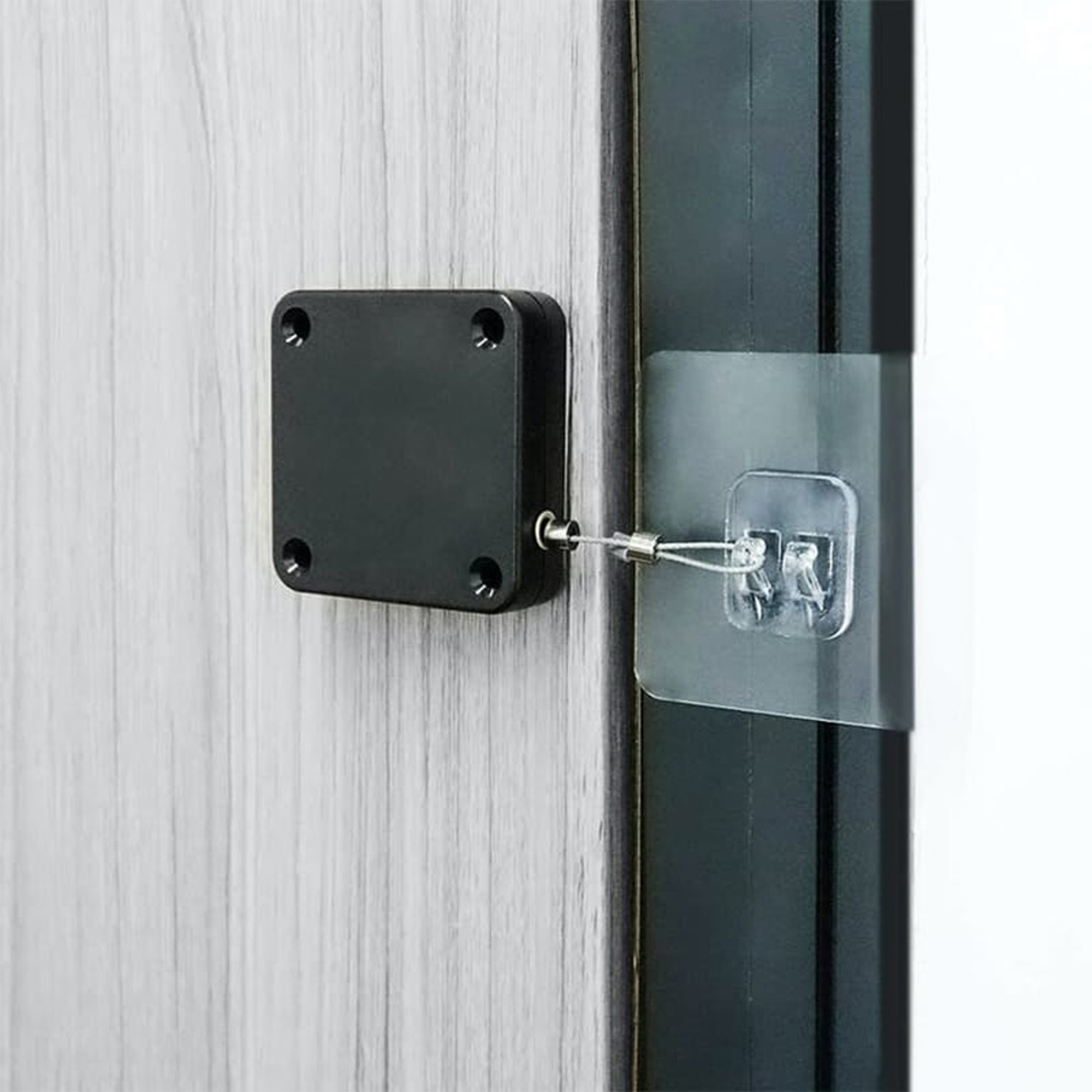 يُركّب غالق الأبواب على سطح نظيف باستخدام اللاصق، ويُضبط السلك حسب قوة الإغلاق المطلوبة لضمان إغلاق الباب تلقائيًا.